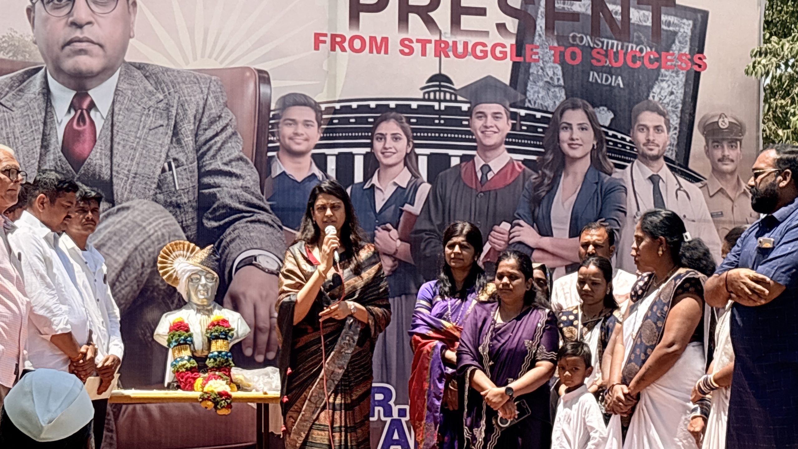 रणरागिणी सौ धनश्री ताई विखे पाटील यांच्या हस्ते महामानव डॉ. बाबासाहेब आंबेडकर यांच्या मूर्ती ची पूजा करून अभिवादन करण्यात आले. धनश्री ताईंनी महामानवा च्या विचाराची आपल्या जीवनात आचरणात आणण्याची गरज असल्याचे सांगितले.कै पोपटराव बनसोडे कमानीजवळ पुतळ्याची आकर्षक फुलांनी सजावट करण्यात आली होती. विद्युत रोषणाईने परिसर उजळून निघाला होता. “जय भीम”च्या घोषणांनी