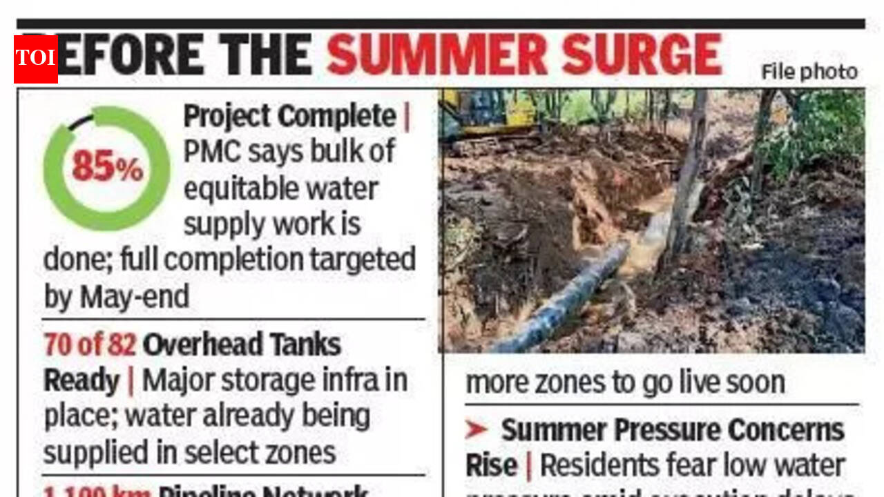 पुणे: नागरी संस्थेने म्हटले आहे की शहरातील समान पाणी पुरवठा प्रकल्पाचे सुमारे 85% काम पूर्ण झाले आहे आणि उर्वरित काम मे अखेरपर्यंत केले जाईल, जरी नागरिकांनी डिसेंबर 2025 च्या अंतिम मुदतीत विलंब झाल्याचे वर्णन केले आहे. पुणे महानगरपालिकेने (PMC) सांगितले की, आत्तापर्यंत 82 पैकी 70 ओव्हरहेड पाण्याच्या टाक्या बांधल्या गेल्या आहेत आणि 1,200 किमी लांबीच्या वितरण लाईनच्या लक्ष्यित नेटवर्कपैकी सुमारे 1,100 किमी घातली गेली आहेत. मात्र, 30,000 स्वयंचलित वॉटर मीटर बसविण्याचे काम प्रलंबित राहिल्याने नागरिकांचा विरोध होत आहे. नवनिर्वाचित नगरसेवक लोकांना निर्णय स्वीकारण्यास प्रोत्साहित करण्यास मदत करू शकतात, असे प्रशासनाने म्हटले आहे.अपव्यय कमी करताना, पाण्याचा दाब आणि संपूर्ण शहरात वितरण वाढविण्याच्या उद्देशाने हा प्रकल्प राबविण्यात येत आहे. पीएमसी अधिकाऱ्यांनी सांगितले की, डिस्ट्रिब्युशन लाईन आणि ओव्हरहेड टँकचे मूलभूत काम पूर्ण झाल्यानंतर, वेगवेगळ्या झोनमध्ये टप्प्याटप्प्याने योजना अंमलात आणली जाईल. पाण्याच्या पाइपलाइनशी संबंधित सर्व पायाभूत कामे पूर्ण करण्यासाठी पुढील दोन महिने महत्त्वाचे आहेत, असे ते म्हणाले.नागरी पाणीपुरवठा विभागाच्या एका वरिष्ठ अधिकाऱ्याने सांगितले की, “प्रकल्पासाठी शहरातील 140 झोन निश्चित करण्यात आले आहेत. 40 झोनमधील कामे यशस्वीरीत्या पूर्ण करण्यात आली आहेत. आम्ही या भागात नव्याने बांधलेल्या ओव्हरहेड टाक्यांमधून पाणीपुरवठा करण्यास सुरुवात केली आहे. पुढील दोन महिन्यांत आणखी झोनमध्ये सुविधा कार्यान्वित होतील.”दरम्यान, विविध परिसरातील रहिवाशांनी या प्रकल्पाच्या परिणामाबद्दल भीती व्यक्त केली आहे. त्याच्या यशाचा अभ्यास करण्यासाठी प्रशासनाने लवकरात लवकर त्याची अंमलबजावणी सुरू करावी, असे त्यांनी म्हटले आहे. हडपसरचे रहिवासी अरुण गाडगीळ म्हणाले, “प्रकल्पाची गती संथगतीने सुरू आहे. नवीन ओव्हरहेड टाक्यांमधून पुरवठा सुरू व्हायचा आहे. उन्हाळा सुरू असून पाण्याचा दाब कमी होण्याची शक्यता आहे. प्रशासनाने हे काम लवकर पूर्ण करायला हवे होते.” पीएमसीच्या सूत्रांनी सांगितले की, विविध सरकारी विभागांकडून ना हरकत प्रमाणपत्रे मिळण्यास होणारा विलंब हे संथ प्रगतीचे प्रमुख कारण आहे. प्रकल्पाअंतर्गत उर्वरित कामे पूर्ण करण्यासाठी प्रशासनाने रस्ते खोदणे आणि वाहतूक वळवण्याची परवानगी मागितली आहे.