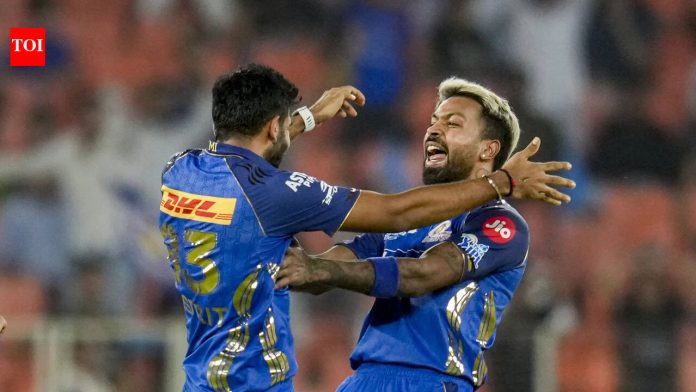 मुंबई इंडियन्सचा जसप्रीत बुमराह कर्णधार हार्दिक पांड्यासोबत साजरा करत आहे (पीटीआय फोटो)